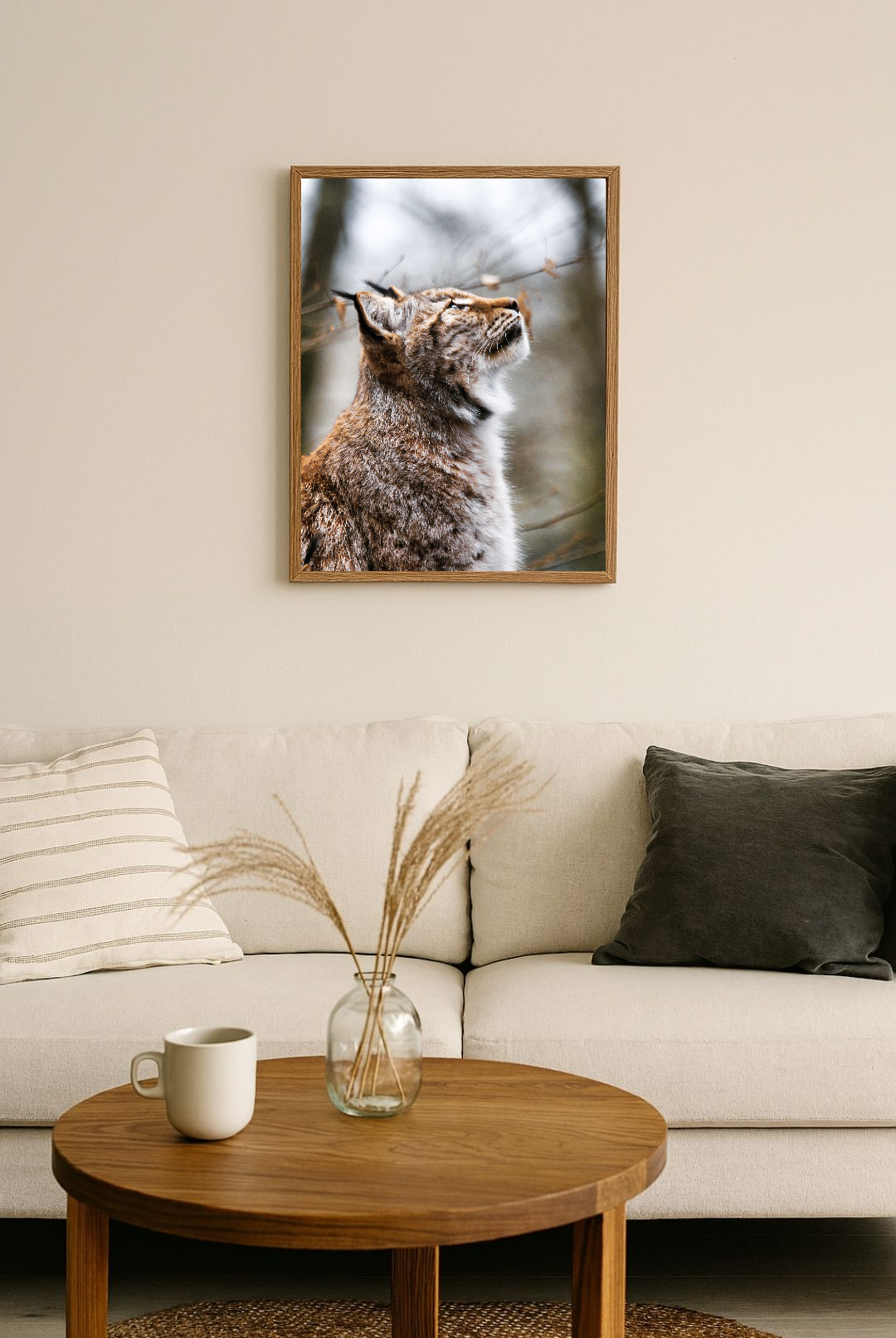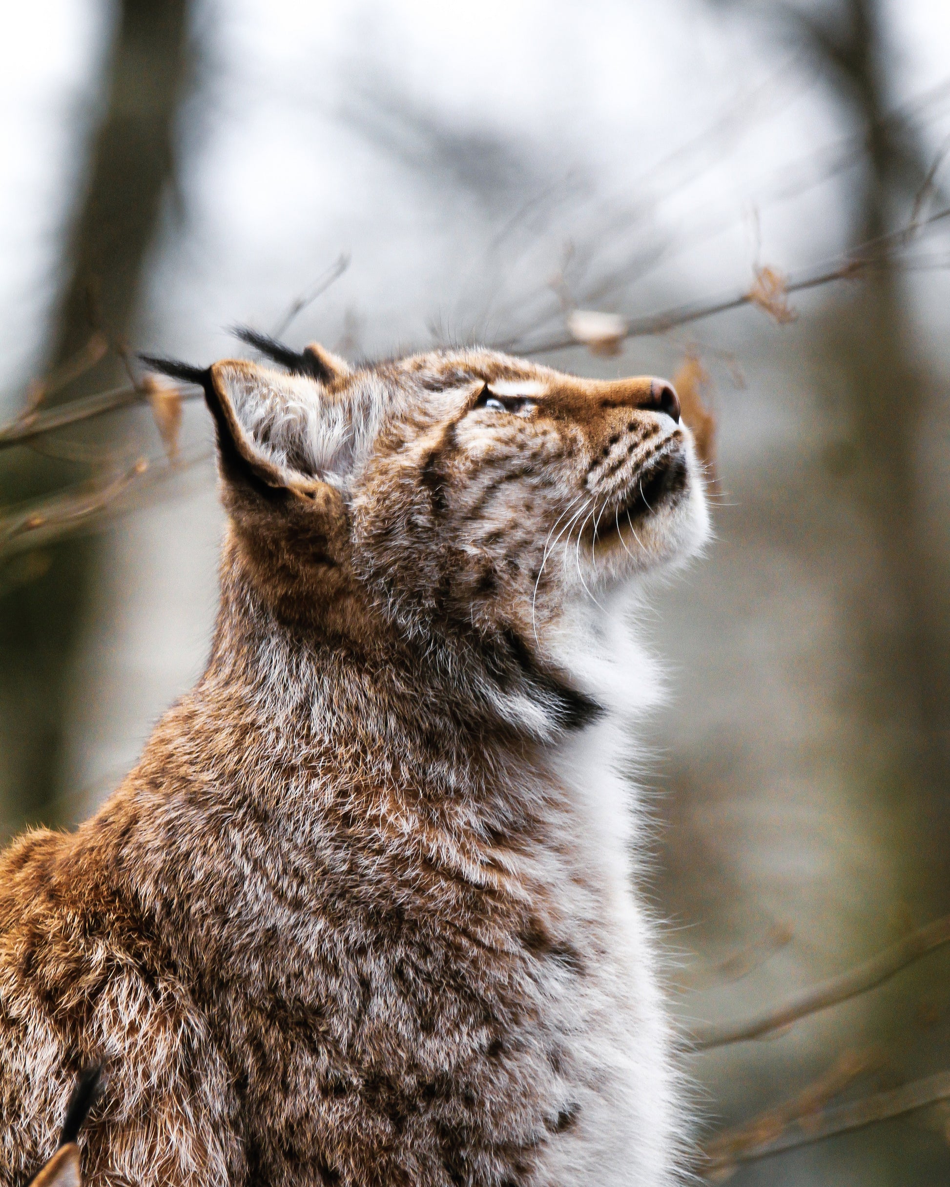 Sous un ciel d’hiver silencieux, le lynx lève la tête comme s’il écoutait les secrets portés par le vent entre les branches nues •